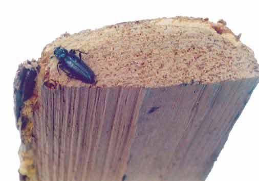 Der Hausbock ist neben den Poch- oder Klopfkäfer der am meisten verbreitete Gebäudeschädling. Der etwa 1,5 cm große, baunschwarze Käfer mit der weißlichen bindenartigen Beharung auf den Flügeldecken nimmt wahrscheinlich keine Nahrung zu sich, während die Larve vorwiegend im äußeren weichen Splintholz von Nadelholz direkt unter der Oberfläche Gänge bohrt. Für die Larvenentwicklung sind warme, feuchte Klimaverhältnisse vorteilhaft. In Gebäuden findet man diese vorwiegend am Konstruktionsholz des Dachstuhls, aber auch in der Balkenlage der oberen Stockwerke. Die Larven durchziehen fressend das Splintholz und erreichen eine Körperlänge von etwa 3 cm. Die Fraßgänge liegend unter der Holzoberfläche und enthalten kleine Holzspäne mit holzfarbenen Kotwalzen. Der Generationszyklus dauert gewöhnlich 3 bis 5 Jahre. Als Flugzeit gelten die Monate Juni und August. Die ovalen Fluglöcher sind etwa 5-10 mm lang und 2-4 mm breit. Rieselstellen bei starkem Befall auch aus Schwindrissen und alten Fluglöchern weisen auf lebenden Hausbockbefall hin. Älteres verbautes Holz von über 60 Jahre wird nur in Ausnahmefällen befallen. Dies liegt daran, dass in älteren Holzzellen die eingelagerte Eiweißkonzentration geringer ist.